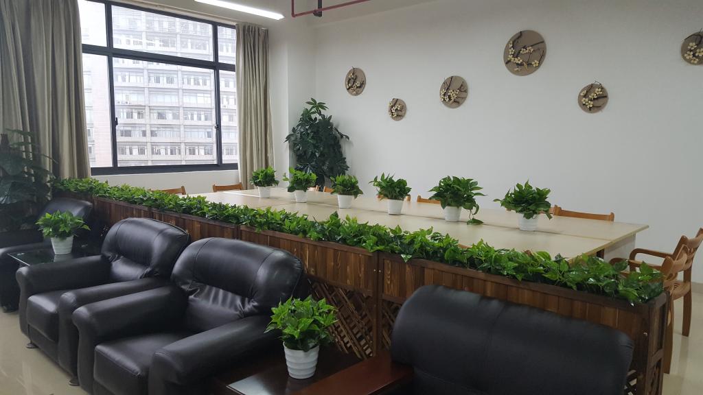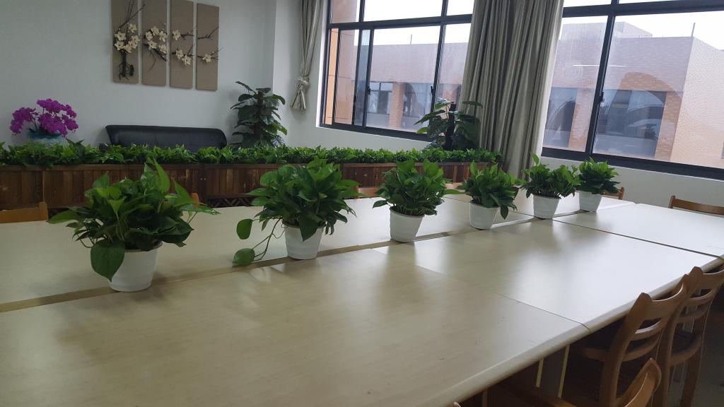 新落成的外院“教工之家”位于25号楼508室,室内宽敞明亮整洁大方,面积足有70多平米,是7号楼原“教工之家”的两倍有余。正中间以沙发和花架将整个“教工之家”分隔成两个不同的功能区。进门左手方区域以大小沙发合围而成,中置茶几,是教职工读书、饮茶、休息、交流、养精蓄锐的好地方;进门右手区域是一个小型会议室的布局,可以作为教师用餐或举办小型沙龙的场所。新的“教工之家”墙面不再单调乏味,以雕花版画饰面装点,清新雅致,四周角落和茶几、桌面上均放置盆栽,给人绿意盎然、生机勃勃、幸福满满的感觉。另外,还备有冰箱、饮水机等,公司也拟视情况再添置一些必要的生活设施、报刊杂志等。