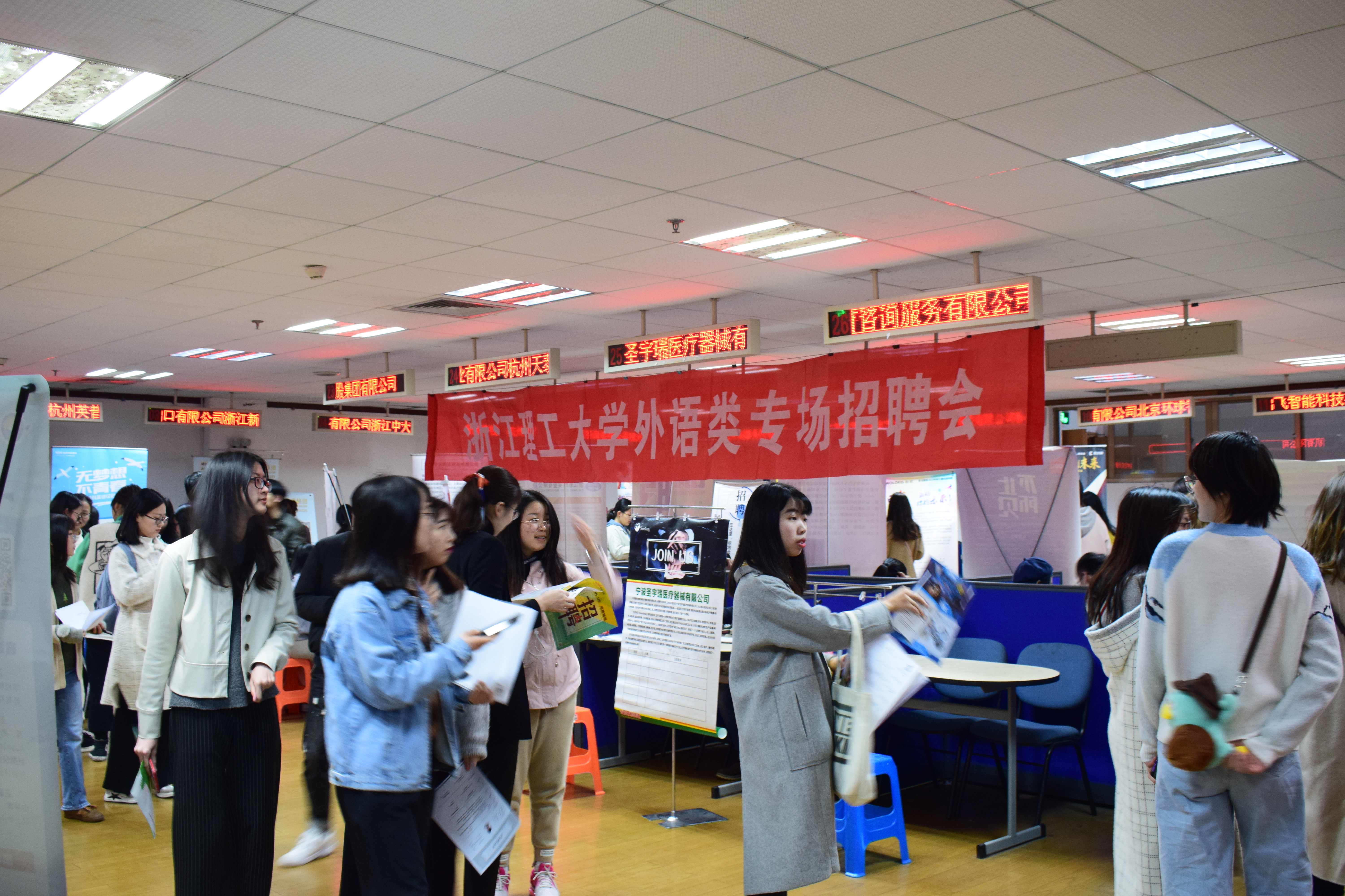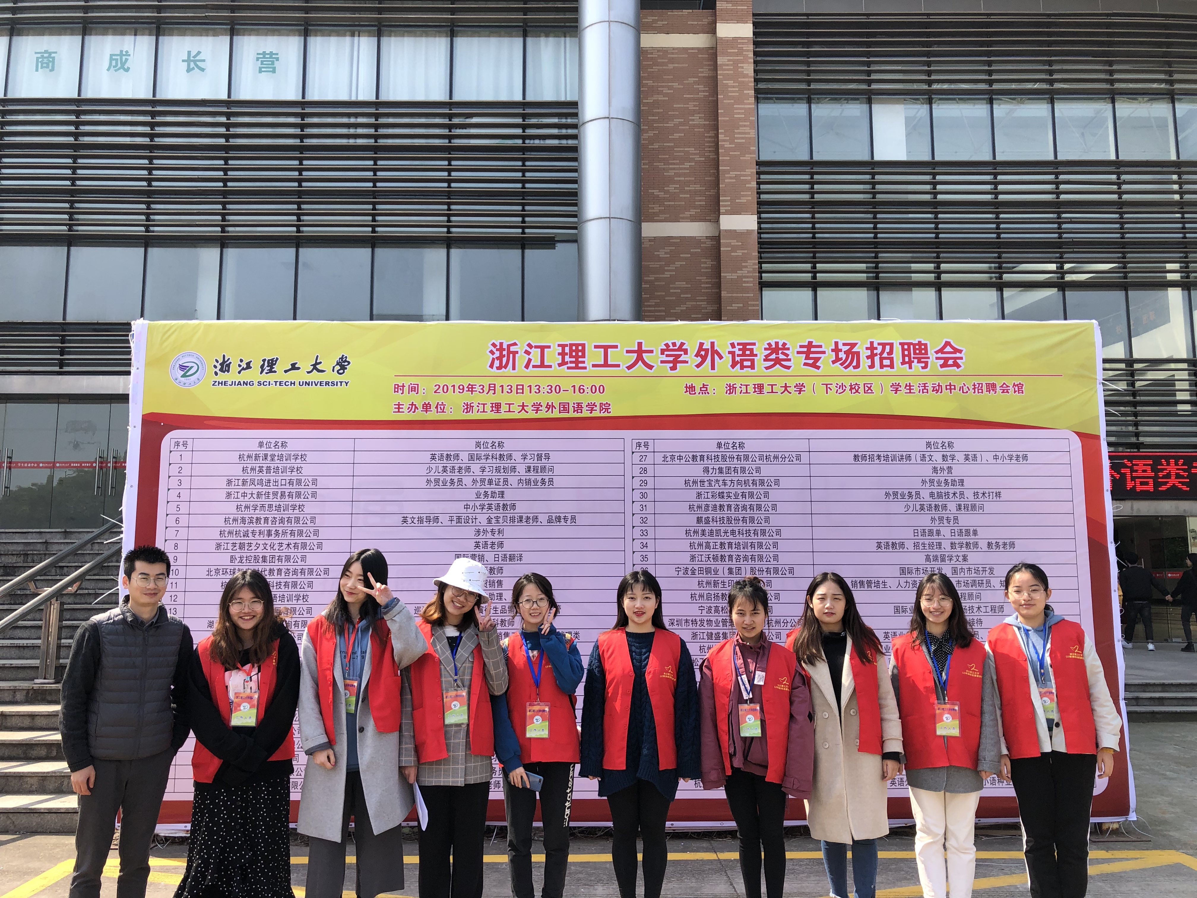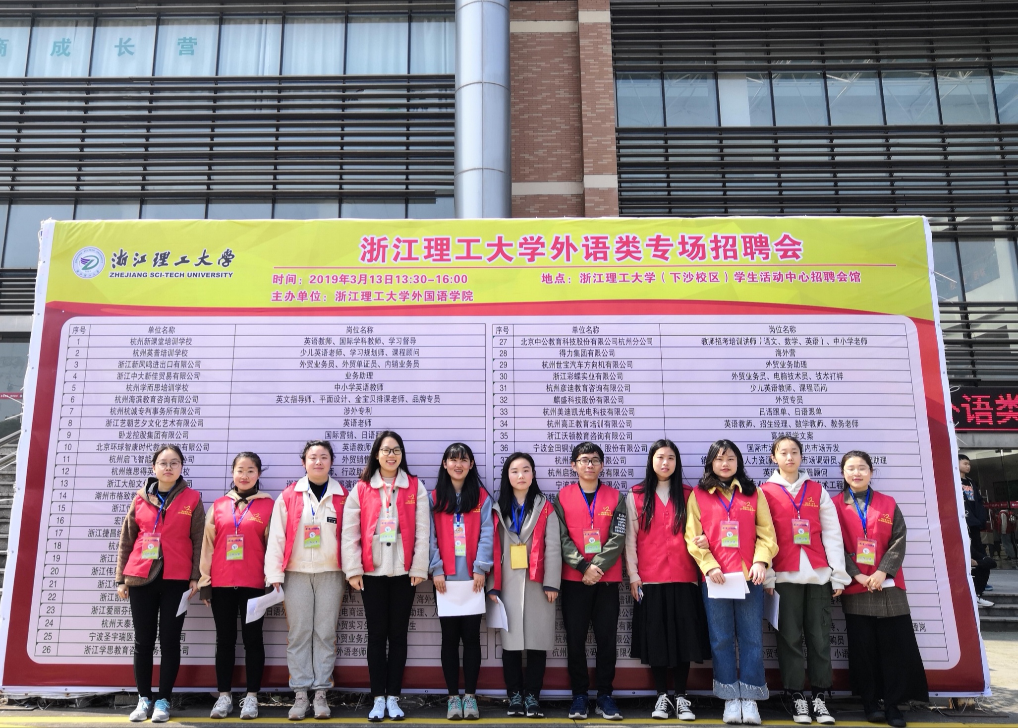 本次招聘会突出外语特色,涉及制造业、教育、批发与零售业等八个行业,招聘专业需求涵盖英语、日语、国际经济与贸易、市场营销等53个本科专业。杭州学而思培训公司、杭州新课堂培训公司、浙江恒逸集团有限公司、宁波金田铜业(集团)股份有限公司、松下家电(中国)有限公司、浙江健盛集团股份有限公司、浙江中大新佳贸易有限公司等55家优质企业参加了招聘会,总计提供1395个岗位,公司毕业生积极参加,外语专业学子在招聘会中展示出来的专业素养和综合素质得到了参会单位的高度评价,不少员工与参会单位达成初步就业意向。招聘会还吸引了中国计量大学、新疆大学等省内外院校的员工前来参与。 志愿服务,展示外语风采