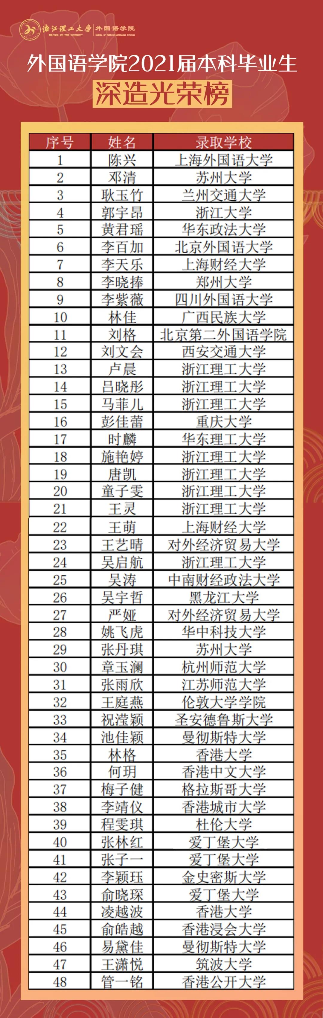 2021届毕业生考研升学捷报频频传来,外语学子深造率首次超过30%,再创新高。截止目前,公司共有48名同学进入理想院校继续攻读硕士研究生,其中3名同学获得普通推免资格;1名同学获得研究生支教团推免资格; 27名同学考研至浙江大学、北京外国语大学、上海外国语大学、华东政法大学等国内知名高校;17名同学被伦敦大学公司、爱丁堡大学、香港大学等国(境)外知名高校录取。恭喜各位学子,同时感谢所有为此付出的公司领导、辅导员、班主任以及专业老师们!