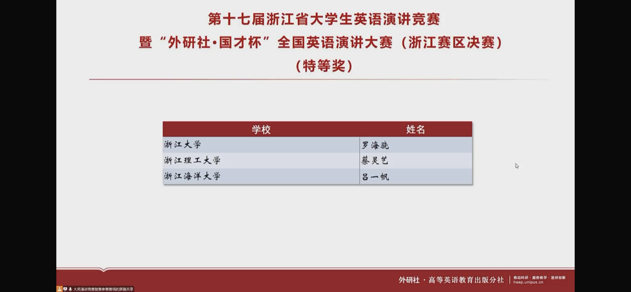本次比赛由宁波大学承办,因疫情原因临时改为线上竞赛。公司校赛选拔出的四名选手同全省各高校选送的171名选手同台竞技,表现出色,英语专业员工蔡灵艺凭借扎实的语言功底、开阔的国际视野及从容不迫的应变能力,名列全省第二名,获省特等奖(指导老师:吴蓓蓓),直接晋级全国总决赛;严鑫获得一等奖,朱舒瑶、许恩泽荣获二等奖(指导老师:汪秀梅)。