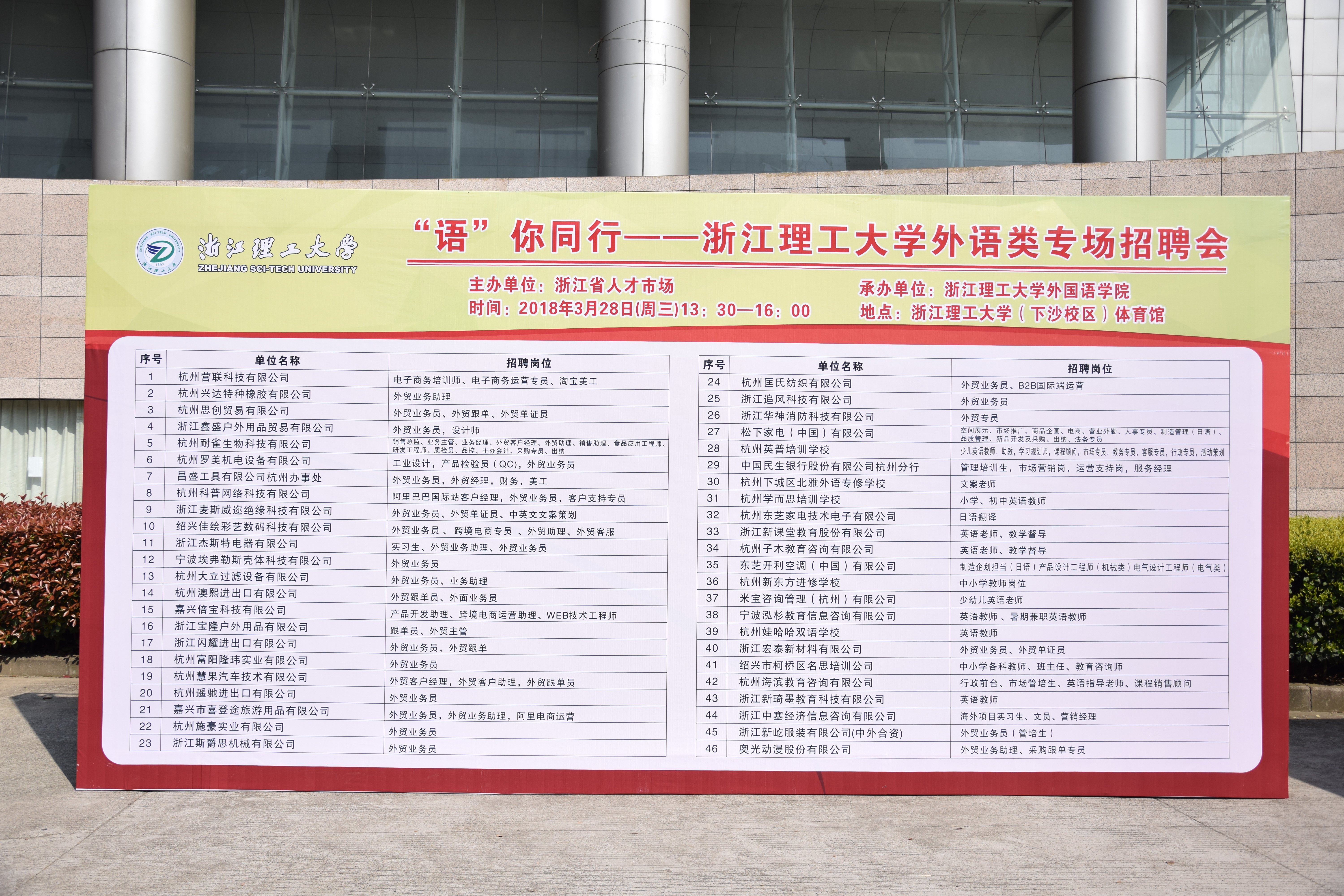 本次招聘会突出外语特色,主要岗位需求以英语、日语、法语专业为主,涵盖外贸类、外语教育培训类、法务类、机械类等行业。参会企业包括杭州新东方进修公司、杭州学而思培训公司、东芝开利空调(中国)有限公司、浙江新屹服装有限公司(中外合资)等企业,提供了150余个岗位,吸引了包括公司、浙江工商大学、中国计量大学、同济大学浙江公司等院校200余名员工参与。
