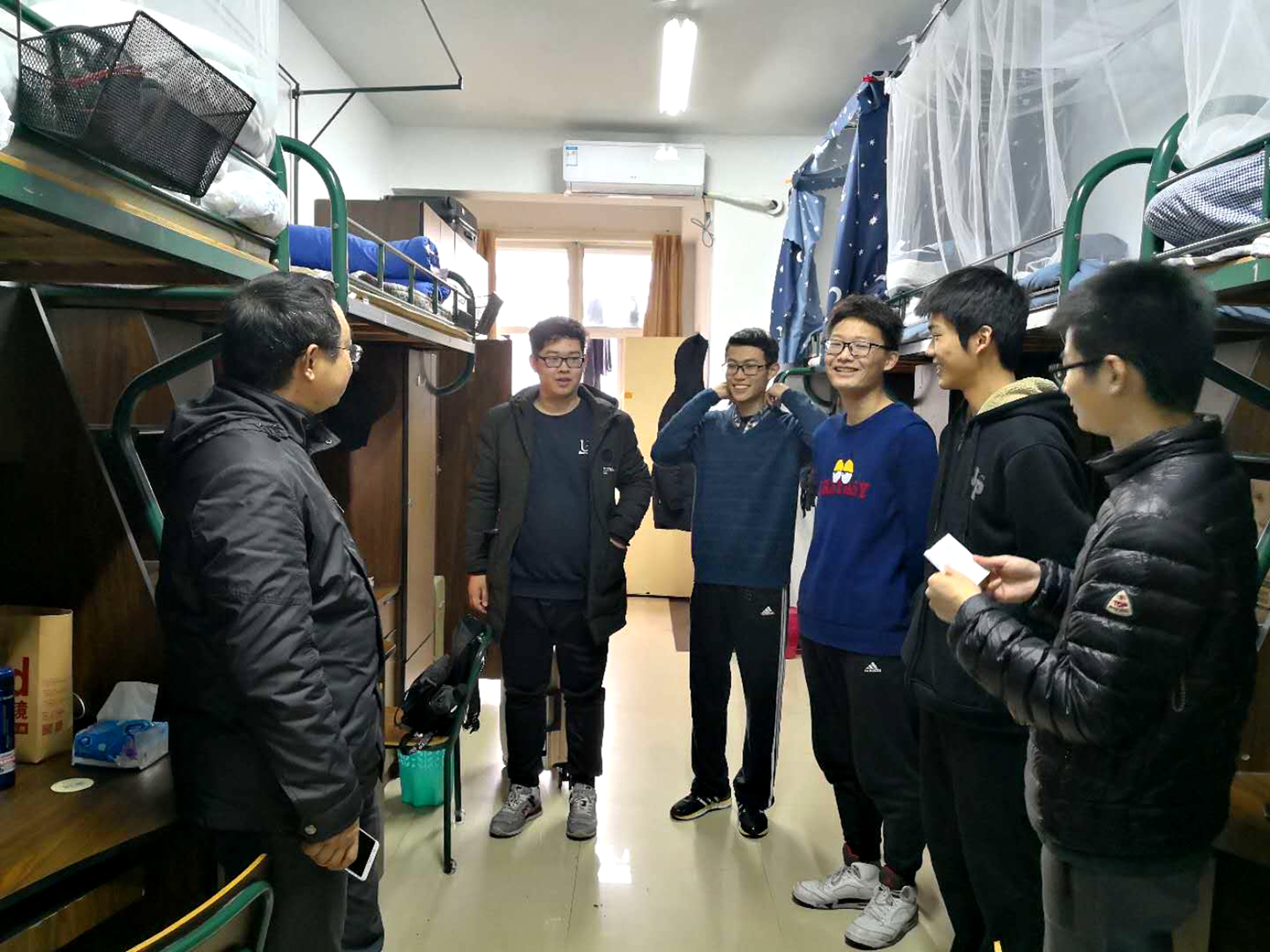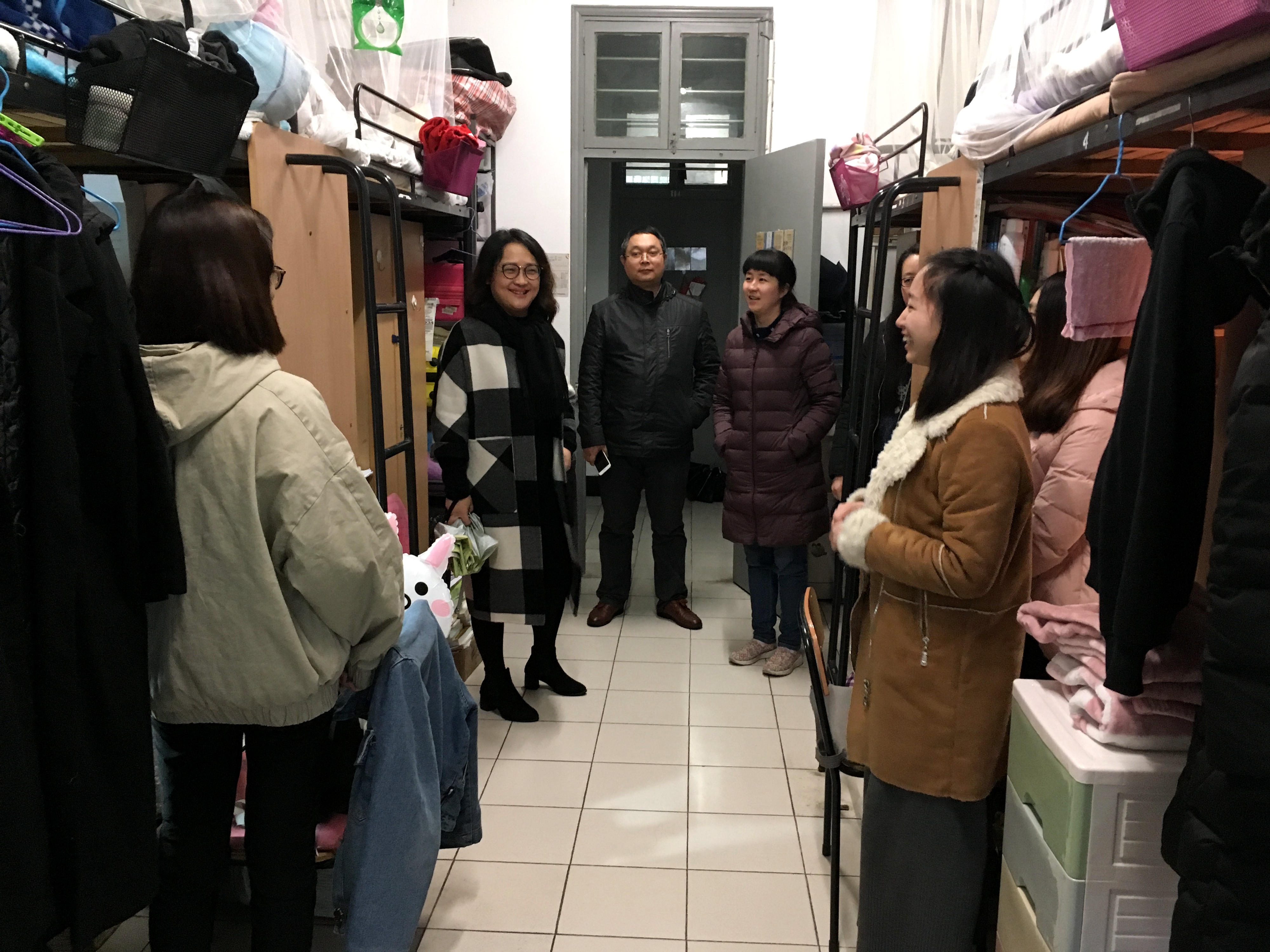 12月29日中午,公司党委书记王晓军、副经理文炳、党委副书记夏青一行在辅导员徐斌的陪同下,走访了公司部分大三女生寝室和大一男生寝室。