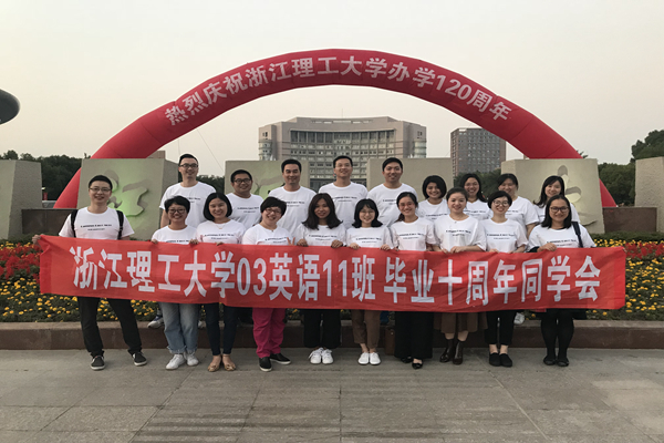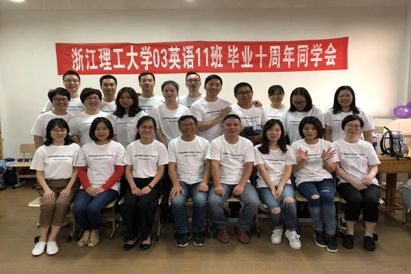 经前期精心筹划,各班级在公司志愿者的协助下顺利开展了毕业十周年同学会。十年再聚,每个班级都异常重视,各班定制了横幅和纪念班服,准备了同学会纪念品,并邀请了当年班主任及任课教师到场。同学会上,所有人围坐一圈,轮流发言讲述自己这十年来的经历、表达重返母校的感慨。03级英语11班邀请了班主任林联村和任课教师伍锋教授参与同学会,伍锋教授特意给时隔10年回校的学子们上了题为"Transition, adaptation and life-long learning"的人生一课。毕业十年,意气风发的学子们重回课堂,在相同的教室再次聆听老师的教诲,这是一次回归,也是再一次从浙理出发。