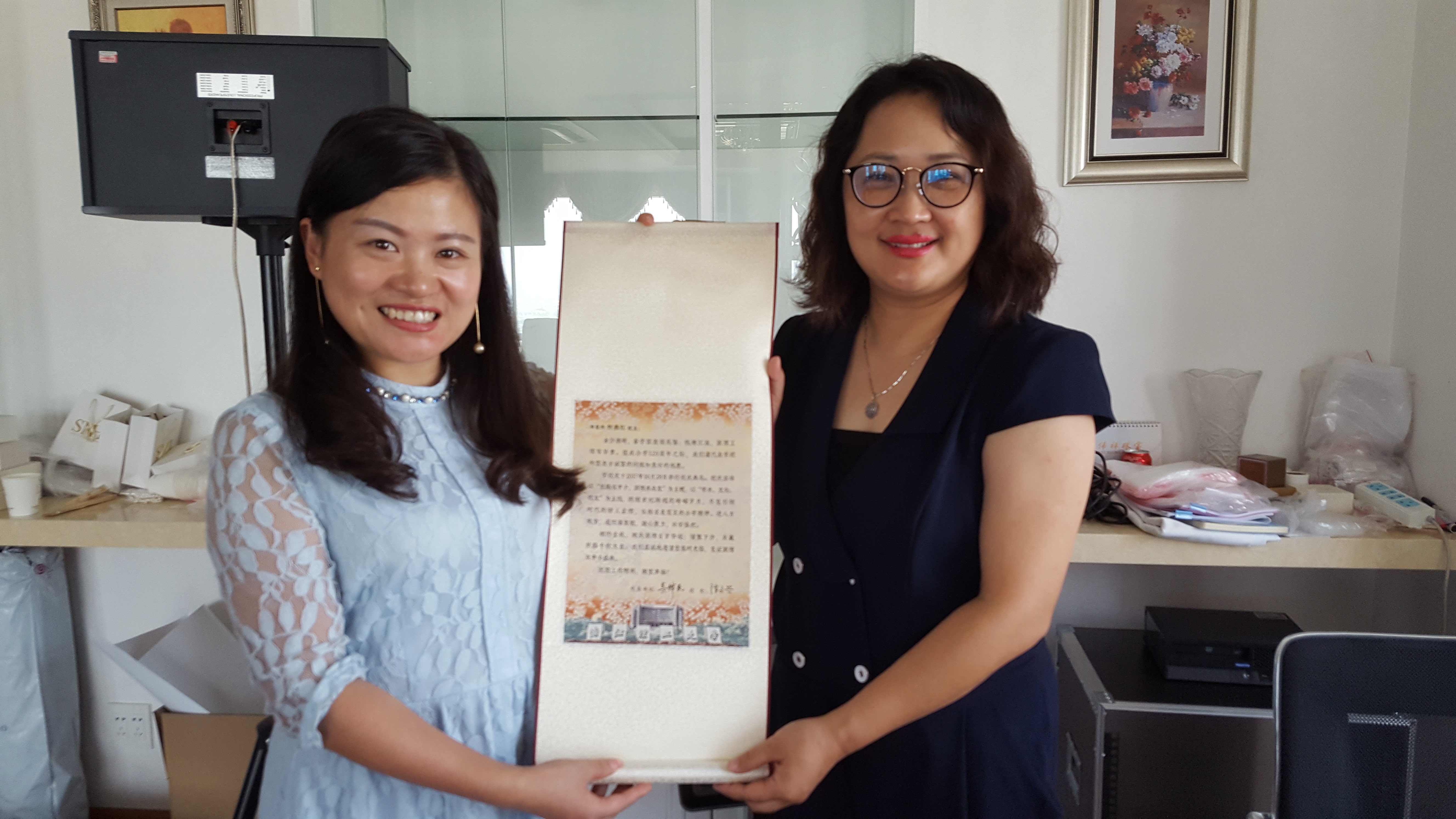 王晓军向何燕红介绍了公司发展,通报了校庆的筹备情况,代表公司真挚邀请何燕红回母校看看,并赠送了公司120周年校庆织锦邀请函。何燕红回忆起在公司学习、工作、生活的美好时光,讲述了自己近几年的工作、生活情况,表示自己的成长离不开公司、公司的培养。王晓军一行还参观了公司珠宝展示厅、网络销售直播间等场地。