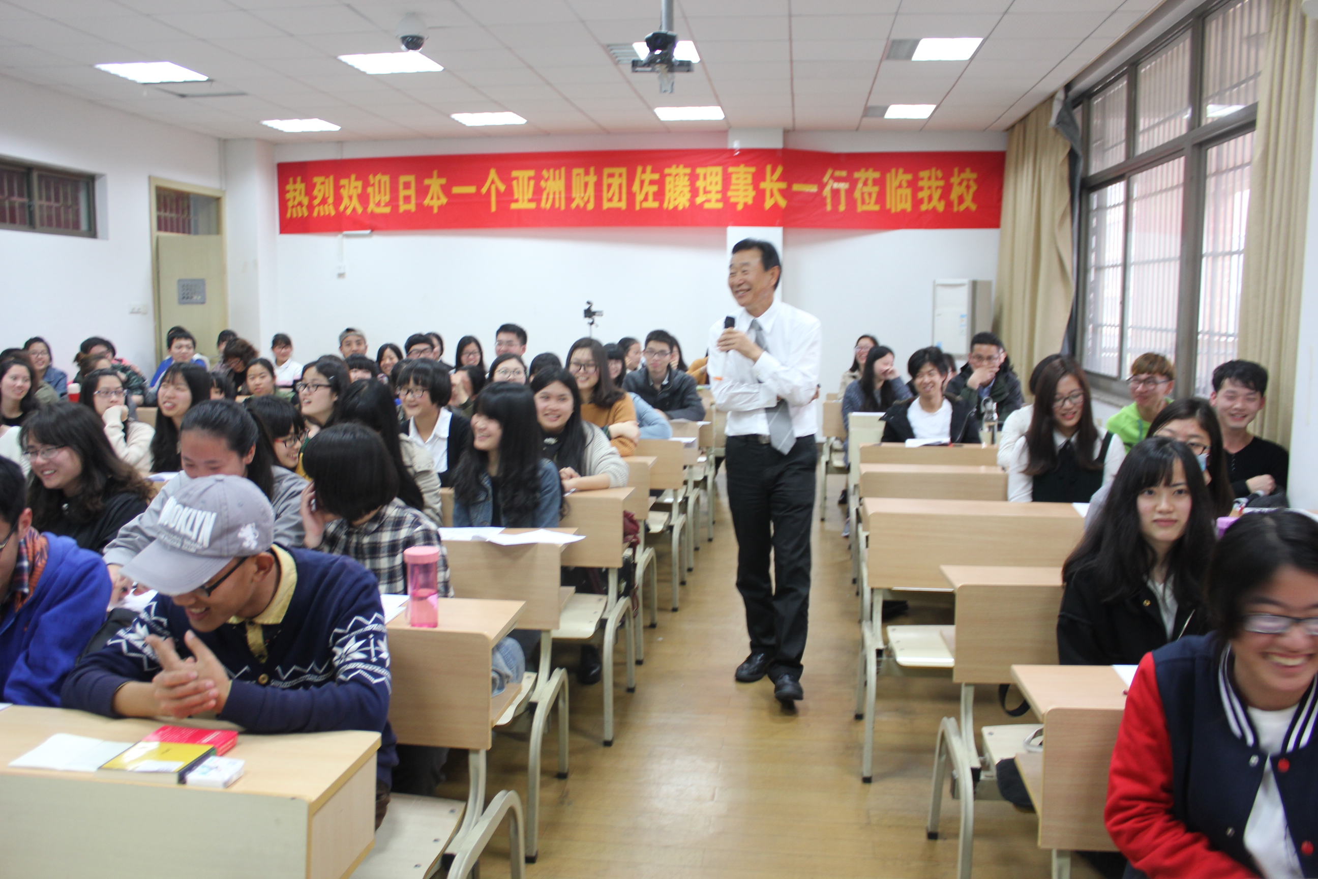 佐藤洋治先生是创立日本“同一个亚洲”财团(One Asia Foundation)的法人代表,该财团以“倡导东亚区域一体化,透过亚洲各国经济、教育、文化与市民交流,创造共有的价值观,达到世界安定与和平”为目的,目前已资助全球390所大学,其中中国大学69所。本次讲座,随佐藤先生一同前来的还有其儿子以及该财团首席研究员郑俊坤先生和财团顾问复旦大学日本研究中心徐静波教授,公司陈越、黄学杰、外教西川昌芳、川村清美等老师也在百忙之中赶来聆听了讲座。