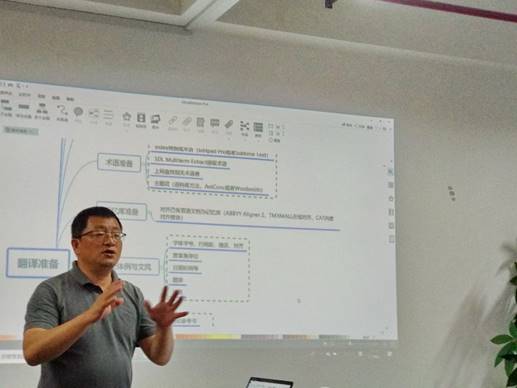 接着,何博士就图书翻译出版展开了具体的说明,认为人文社科图书翻译是被低估的事业,并向大家分享了图书翻译的目的、人文社科图书翻译的功能、热点图书翻译的选择、图书翻译的要点和难点等。然后,何博士便具体而又详细地展开了其图书翻译出版的基本流程,从译前准备,包括了解客户要求、了解学科知识、创建术语库、确定文体风格和体例等,到使用计算机辅助技术进行翻译,到内部、外部的审校,再到译文的润色修改等。在新技术引入翻译领域之后,在互联网背景下的今天,何博士强调了搜商的重要性。作为一名现代的译者,要学会查资料和运用计算机辅助翻译工具如Trados等来协助翻译。接下来,何博士向大家分享了几本失败的翻译图书案例,表达了自己对其惋惜和遗憾之意。他表示,翻译是一门严谨而又高尚的工作,不可低估翻译的重要性,并阐释了影响译文质量的几个要素,告诫我们对翻译要持严肃、谨慎的态度。最后,何博士向大家分享了图书同步出版的流程,说明了如何保证译本时效性的方法。