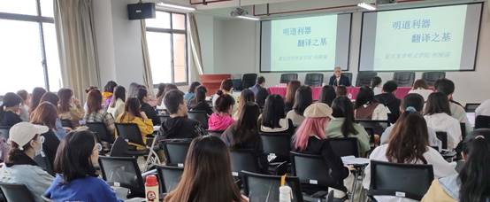 第二,英文的功夫要锤炼。首先要有相当的扎实的输入,在翻译中做到流利、道地、得体、出手快、对细微之处敏感。具体而言,在翻译中,应注意场合,锤炼词语。何教授以诸多实例向我们讲授了英语小词的灵活而准确的用法,并以实例讲解了人工翻译较机器翻译的优长之处。同学们认真聆听,收获颇丰。