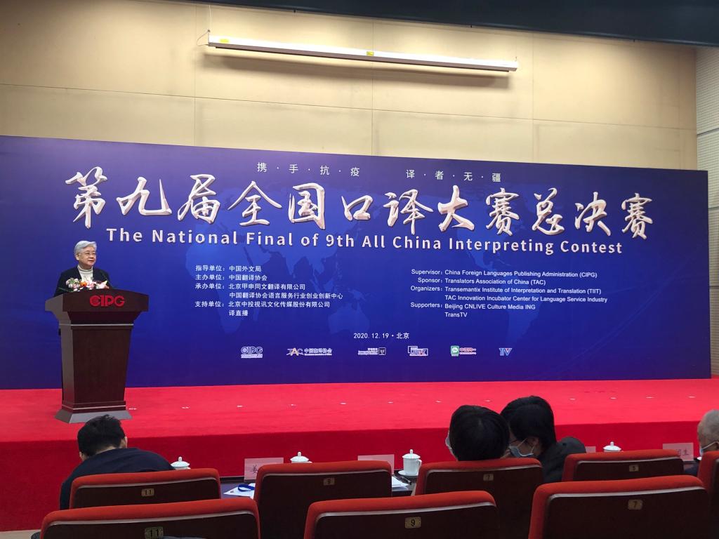 中国翻译协会顾问唐闻生、朱英璜,常务理事徐亚男,当代中国与世界研究院副经理、中国翻译协会副秘书长杨平等出席大赛总决赛闭幕式暨颁奖典礼,并为获奖选手和指导老师颁发奖杯、荣誉证书。作为老一辈的口译员,唐闻生先生在闭幕式上致辞。她希望广大翻译工作者、特别是青年翻译工作者,牢记使命,勇于担当,学好本领,夯实基础,好好把握新时代赋予的大好机遇,开阔全球视野,树立大局意识,为推动我国翻译事业繁荣发展和中华民族伟大复兴做出贡献。