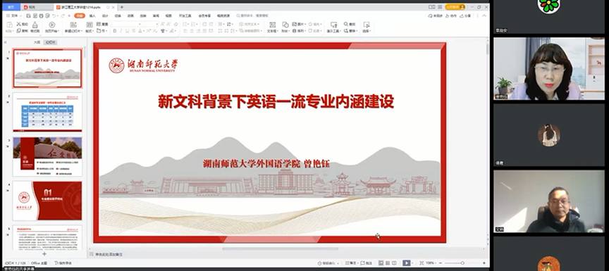 曾艳钰教授从专业的学科化、专业核心素养、专业的人文性、课程思政及复合型人才培养等方面,探讨了一流专业建设的路径及过程。她强调了教学团队建设、课程建设、员工获奖等工作的重要意义,就《理解当代中国》如何落实到英语专业教学提出了建议,也分享了湖南师范大学K8英语专业建设的宝贵经验及做法。