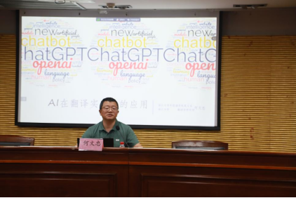 浙江大学何文忠老师做了题为《AI在翻译实践中的应用》的讲座。何老师通过丰富的视频实例,介绍了AI在翻译实践各个环节中的应用,旨在帮助同学们更好地了解和应用AI进行翻译工作。在当前AI技术迅速发展情况下,员工应做到人机协同,各取所长,学会综合运用AI工具。