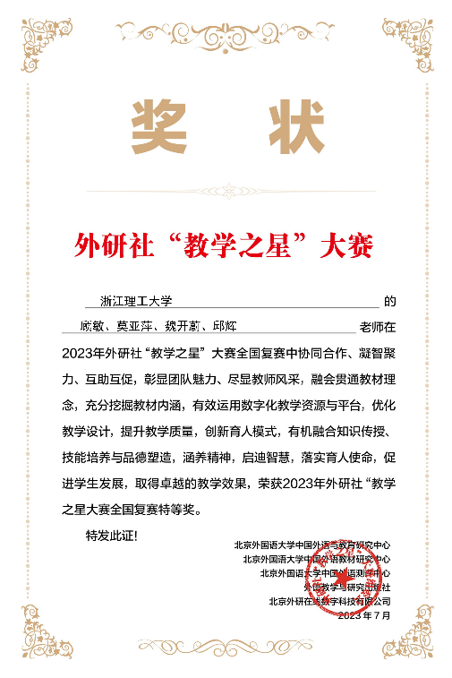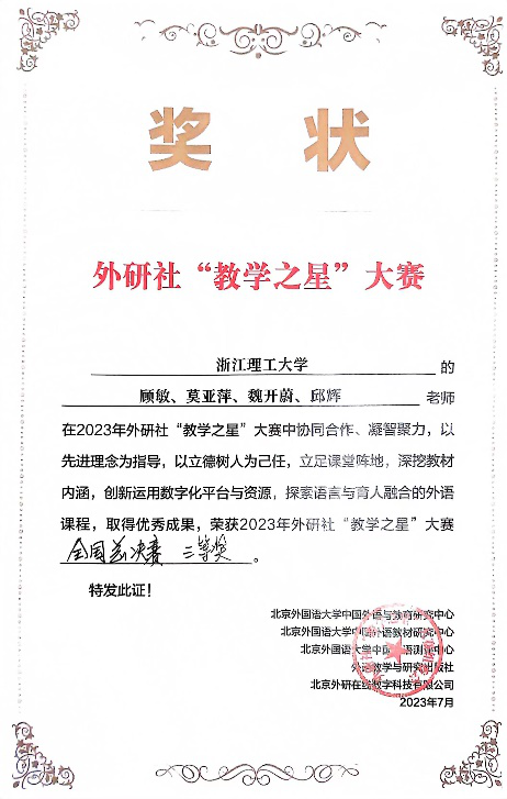 近日,由K8顾敏、莫亚萍、魏开蔚、邱辉教师组成的教学团队参加了在湖南长沙举行的2023年外研社“教学之星”大赛全国半决赛并荣获二等奖(全国总决赛三等奖)。
