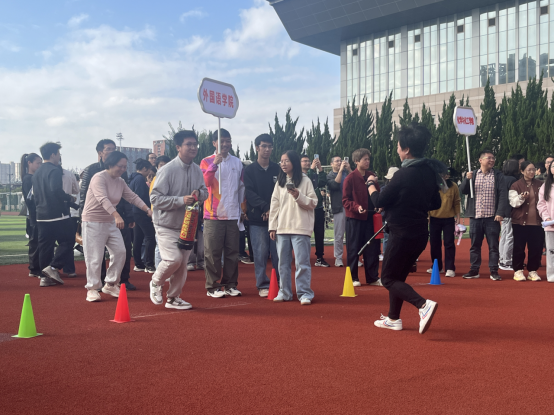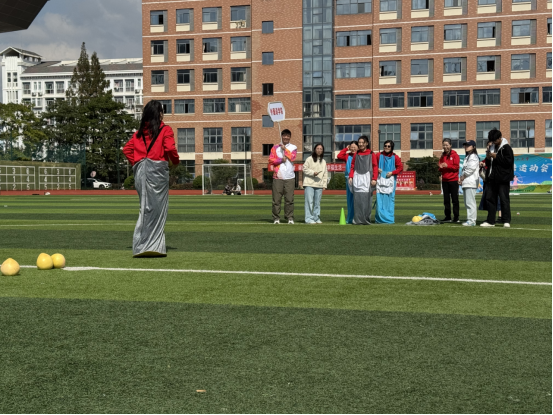而“袋鼠搬瓜”项目则充满了欢乐与童趣。外院教师们身穿袋鼠服,模仿袋鼠跳跃前行,将“瓜果”安全运送到终点。比赛中,老师们相互打气、你追我赶,欢笑声此起彼伏,整个赛场洋溢着轻松愉快的氛围,充分展现了外院教师乐观向上、热爱生活的一面。