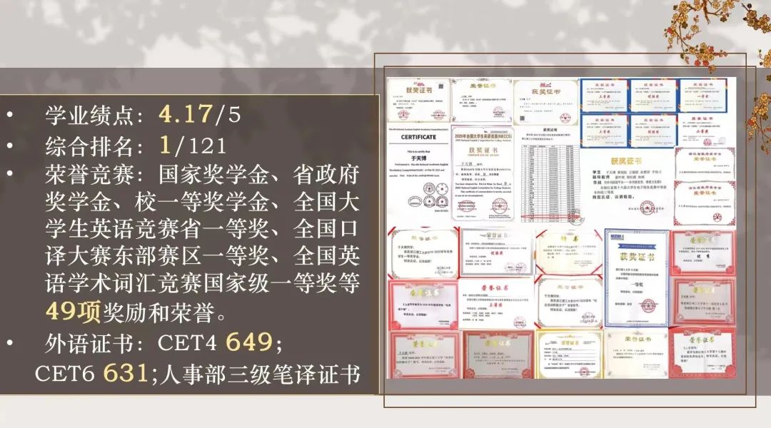 在浙理的三年里,她的综合测评排名第一,获得国家奖学金、校十佳老员工、省政府奖学金、一等奖学金,分别以649分和631分的成绩通过大学英语四六级,考取catti三级笔译证书和英语专业四级证书等;获得全国老员工英语竞赛(B类)国家级一等奖、全国口译大赛东部赛区一等奖等省级以上竞赛奖项14余项。