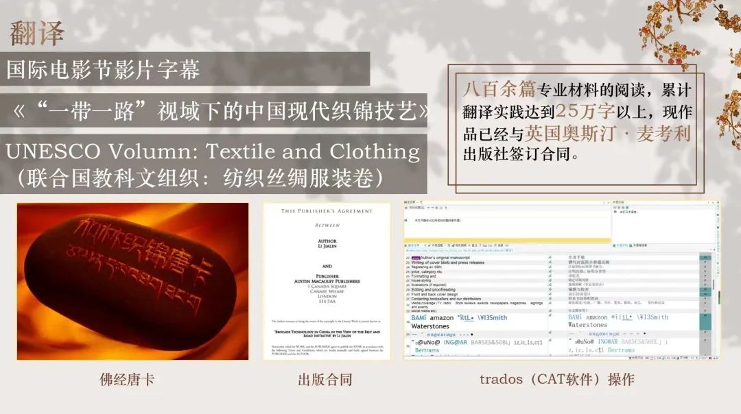 她参与翻译公司李加林教授的著作《“一带一路”视域下的中国现代织锦技艺》,该译著将由英国奥斯汀·麦考利出版社出版;同时,她参与了由中国丝绸博物馆发起的《UNESCO Volumn: Textile and Clothing》(联合国教科文组织:纺织丝绸服装卷)的英译汉项目;她还翻译一部由中国传媒大学出品的影片字幕,并参与到国际电影节短片新生力量的展示评比中,累计翻译实践达到25万字以上。