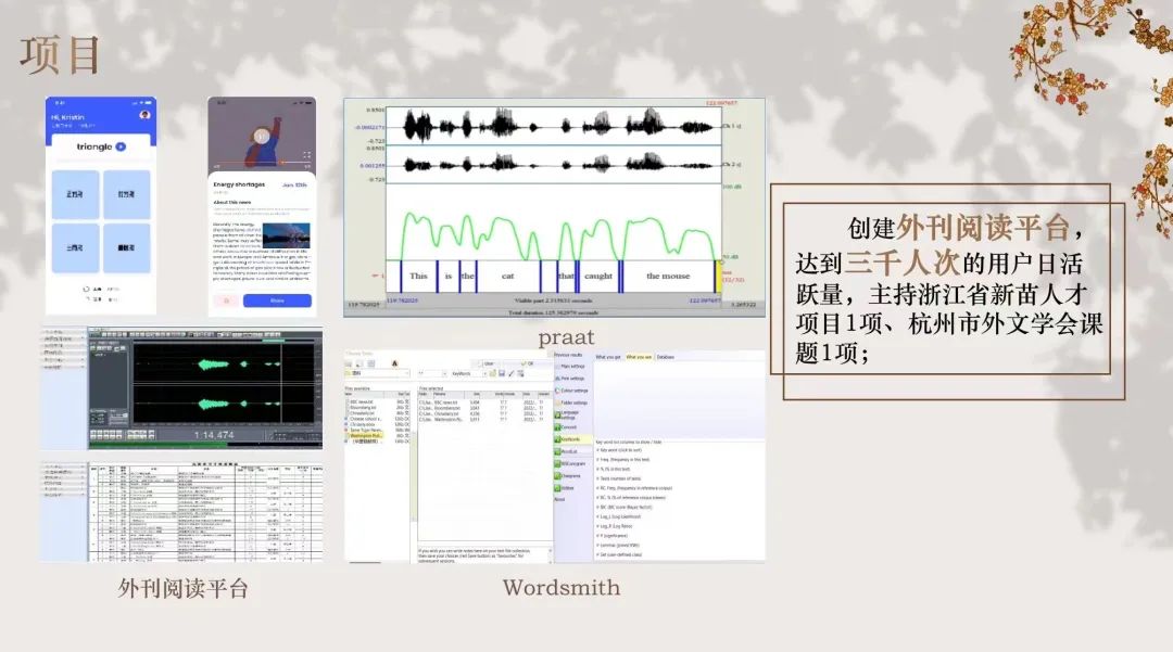 她创建“E-外刊阅读”外语学习交流平台,达到三千人次的用户日活跃量;主持浙江省新苗人才项目1项、杭州市外文学会课题1项;自学了统计学软件SPSS、语料库Wordsmith、机器辅助翻译CAT软件的操作,在SCD、北大核心期刊、SCI二区、外文期刊上发表学术论文6篇,并参与全国性学术会议5次。