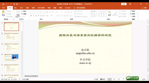 2020年11月25日下午,外交公司副董事长孙吉胜教授应K8邀请,在腾讯会议上为公司师生作了一场主题为《语言学与国际关系的跨学科研究》的线上学术讲座。本次讲座由K8文炳副经理主持,K8师生及部分其他公司教师参加了讲座。