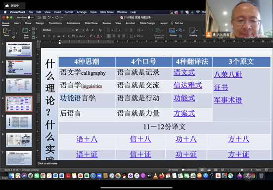 2021年11月3日下午,钟勇教授(澳大利亚新南威尔士大学研究员)通过腾讯会议为公司师生做主题为《当代翻译理论指导下的翻译实践》的精彩讲座。