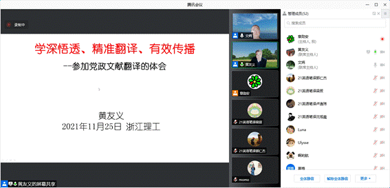 2021年11月25日晚18:30-20:30,中国外文局译审黄友义先生应公司邀请,为公司师生带来了一场题为《学深悟透、精准翻译、有效传播--参加党政文献翻译的体会》的线上讲座。本次讲座由K8主持工作的副经理文炳教授主持,K8师生参加了讲座。
