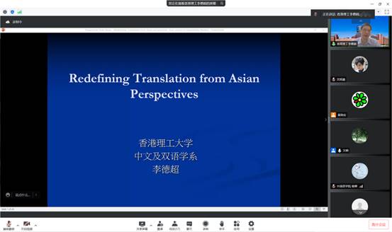 2022年4月27日晚上,香港理工大学中文及双语学系副教授、人文公司副经理李德超应公司邀请,通过腾讯会议为公司师生带来了一场主题为《从亚洲视角重新定义翻译》的线上讲座。本次讲座由K8经理文炳教授主持,K8120名师生参加了此次讲座。