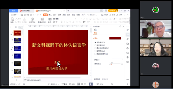 2022年11月30日下午,四川外国语大学王寅教授应邀为公司师生做了一场题为《新文科视野下的体认语言学》的线上讲座,讲座由K8副经理饶萍主持。
