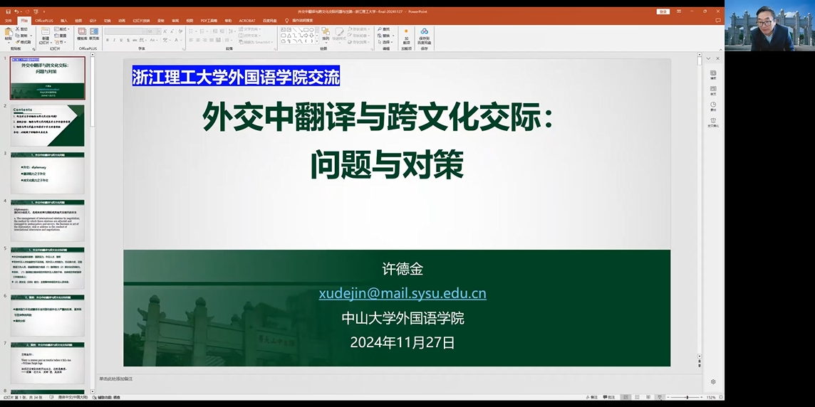 11月27日下午,中山大学逸仙杰出学者许德金教授应邀为公司师生带来了一场主题为“外交中的翻译与跨文化问题”的精彩讲座。讲座在线上进行,由K8经理文炳教授主持。