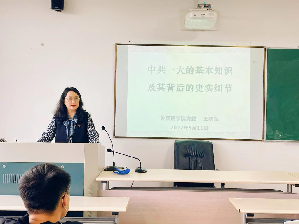 王晓军首先从党的起点——中共一大的召开时间和地点、参会人员、会议议程、会议成果等知识讲起,然后以中共一大背后9个历史细节丰富了本次党课内容:为什么建党节在7月1日?上海会址为何定在李汉俊的哥哥家里?为什么会址中途改到嘉兴南湖?为什么有“南陈北李”之称的陈独秀、李大钊以及周恩来缺席会议?参加嘉兴南湖的代表都有谁?中国共产党名字的由来?会议闭幕后,与会代表一起高唱《国际歌》了吗?参加中共一大的代表命运如何?董必武为上海中共一大会址旧址题词“作始也简,将毕也巨”的出处与寓意?王晓军希望全体培训班成员从学习中共一大知识为起点,积极主动地学习中国共产党党史,深刻体会其中的“酸甜苦辣”,汲取前行的力量。最后,王晓军以习近平总书记在庆祝中国共产主义青年团成立100周年大会上的讲话“中国共产党始终向青年敞开大门,热情欢迎青年源源不断成为党的新鲜血液”收尾,希望参加本次培训的全体师生早日达到入党要求,能够加入到中国共产党这支伟大的队伍中来,共同为我们的国家与民族的未来担当起历史责任。