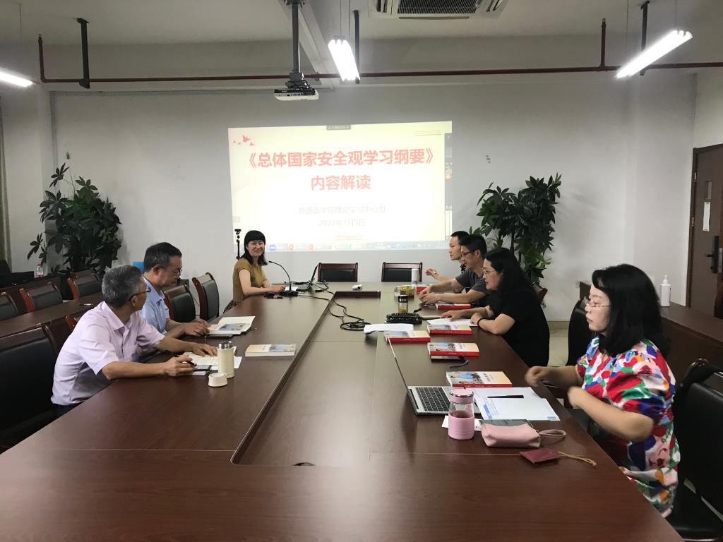 之后,党委副书记夏青对《总体国家安全观学习纲要》进行导学,她指出,《纲要》是用总体国家安全观这一重大原创理论武装全党、推动工作,指导新时代国家安全实践的最新教材,全书以“十个坚持”为基础谋篇布局,全面系统梳理习近平总书记关于国家安全的一系列重要论述。她强调,政治安全是国家安全的根本,要坚决打赢意识形态斗争,全面贯彻党的民族政策和宗教政策,防范化解党的建设面临的各种风险,有力贯彻宗教与教育相分离的政策。会上,党委书记王晓军、英语系教工党支部书记唐岚、日语系教工党支部书记徐芳芳、教工综合党支部书记刘纯、学工办主任岑俊静、综合办公室主任冯保平、组织员郑宇徽等做了交流发言。